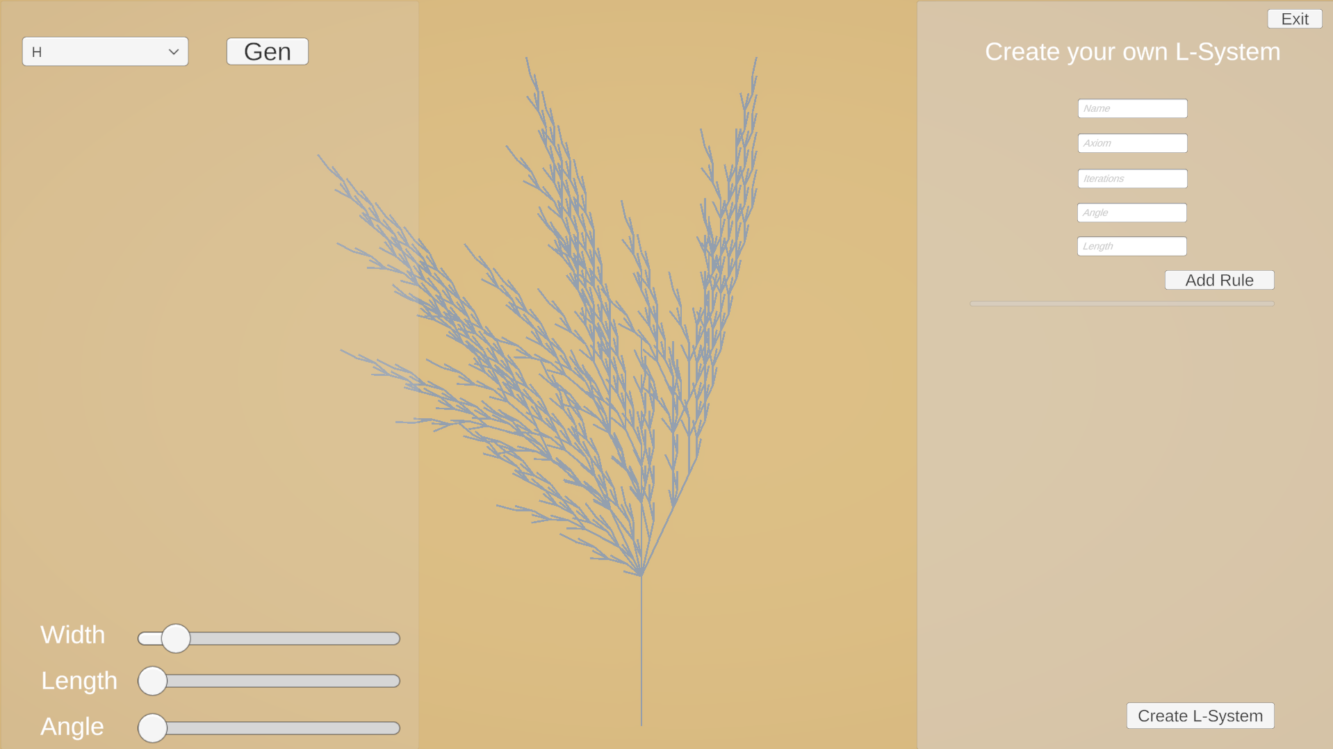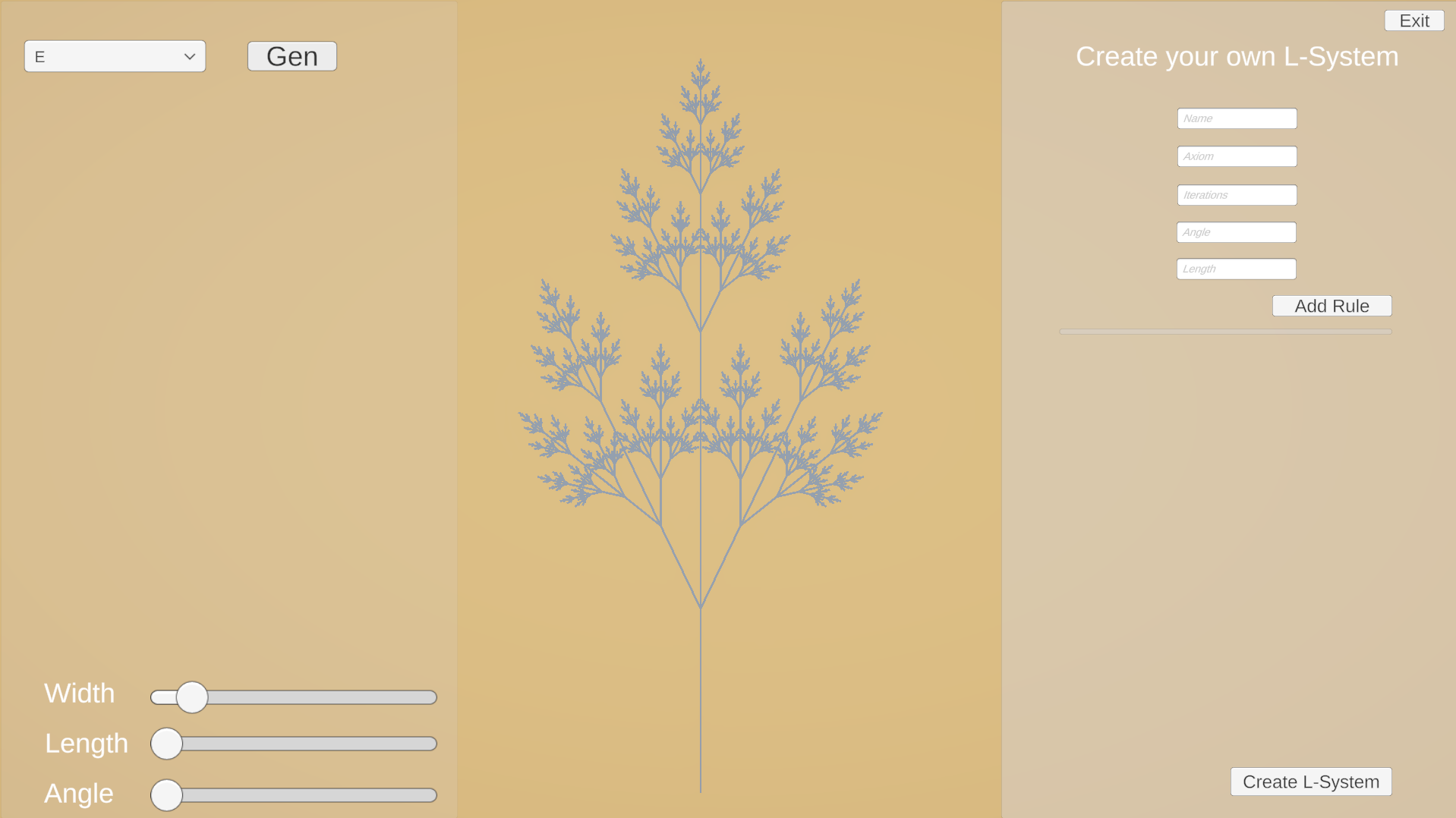 The goal of the project was to create a flexible tool that allows users to define, visualise, and explore Lindenmayer Systems in a real-time environment. The application allows users to explore eight predefined tree models, step through their iterations, and adjust parameters such as angle, segment length, and line width. Additionally, users can create entirely new deterministic L-Systems through an intuitive graphical interface. The system combines real-time visual feedback with hotkey-based controls, making it suitable for experimentation, education, and rapid iteration during development.